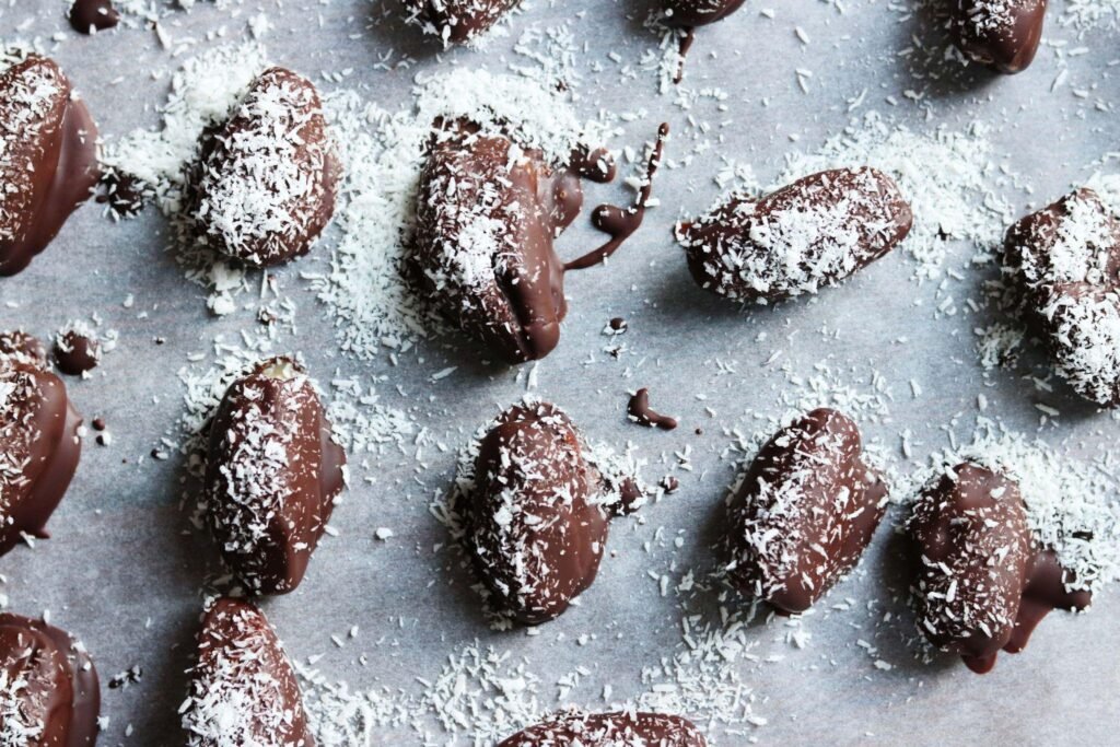 - Fill the dates with tahini and cover with the dark chocolate. Place on a chopping board covered with a sheet of baking paper and sprinkle with desiccated coconut (optional).